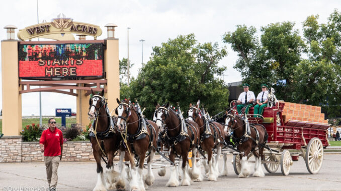 Fargo, ND – The famous Budweiser Clydesdales made a weekend of appearances throughout Fargo-Moorhead area. The Clydesdales appearance was in support of Anheuser-Busch’s support of Folds of Honor. Marking the appearance of the Clydesdales was also co-ordinated with the upgrading of the local icon signage since 2001; the Budweiser sign located at I29 and 94 interchange. Doug Restemayer, president of D-S Beverages presence was at the local celebrations throughout the weekend as well as with the upgrading of the lighting of the billboard for Budweiser.