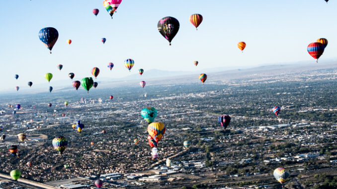 Albuquerque, N.M. – Two fabulous days of green flag for launching Sunday and Monday brought excitement to the large crowds of spectators that filled the field. Both mornings had a large drone light show as the pilots had a briefing and the green flag was raised. A morning glow preceded the Mass ascension after the green flag was raised. Hundreds of balloons inflated and raised toward the beautiful sky Sunday and Monday.
